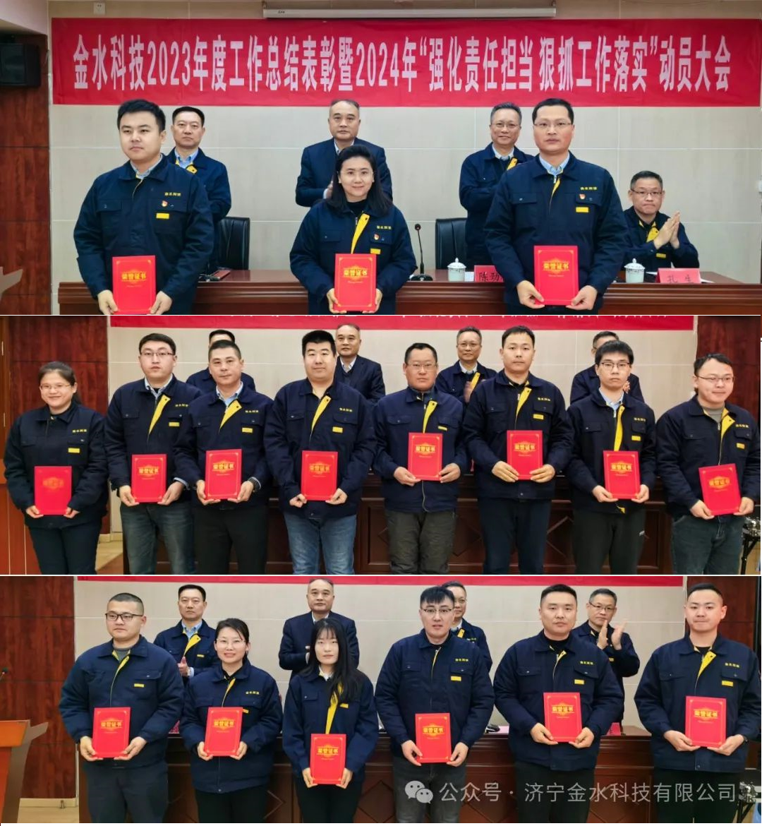 為貫徹落實山東公用部署要求,全面總結(jié)2023年工作,客觀分析研判當(dāng)前形勢,明確深化改革思路,動員全體員工緊扣任務(wù)目標(biāo),高質(zhì)量完成2024年全年任務(wù),2月27日上午,金水科技召開2023年度總結(jié)表彰暨2024年“強化責(zé)任擔(dān)當(dāng) 狠抓工作落實”動員大會。山東公用副總經(jīng)理李燦斌出席會議并講話。會議在《奮楫篤行新征程》的短視頻中拉開帷幕。視頻以大事記的形式全面展示了金水科技2023年全年各項工作的開展實況。一年來的奮斗足跡歷歷在目,取得的成績、帶來的收獲令全體員工備受鼓舞。會議隆重表彰了過去一年公司涌現(xiàn)出的先進工作者和優(yōu)秀黨員,先進個人代表發(fā)言講述了他們的工作和心路歷程,展現(xiàn)出敢于擔(dān)當(dāng)、善于擔(dān)當(dāng)?shù)母墒录で楹蜕谱鳛?、敢作為的先進風(fēng)范,為全體員工樹立了良好榜樣。