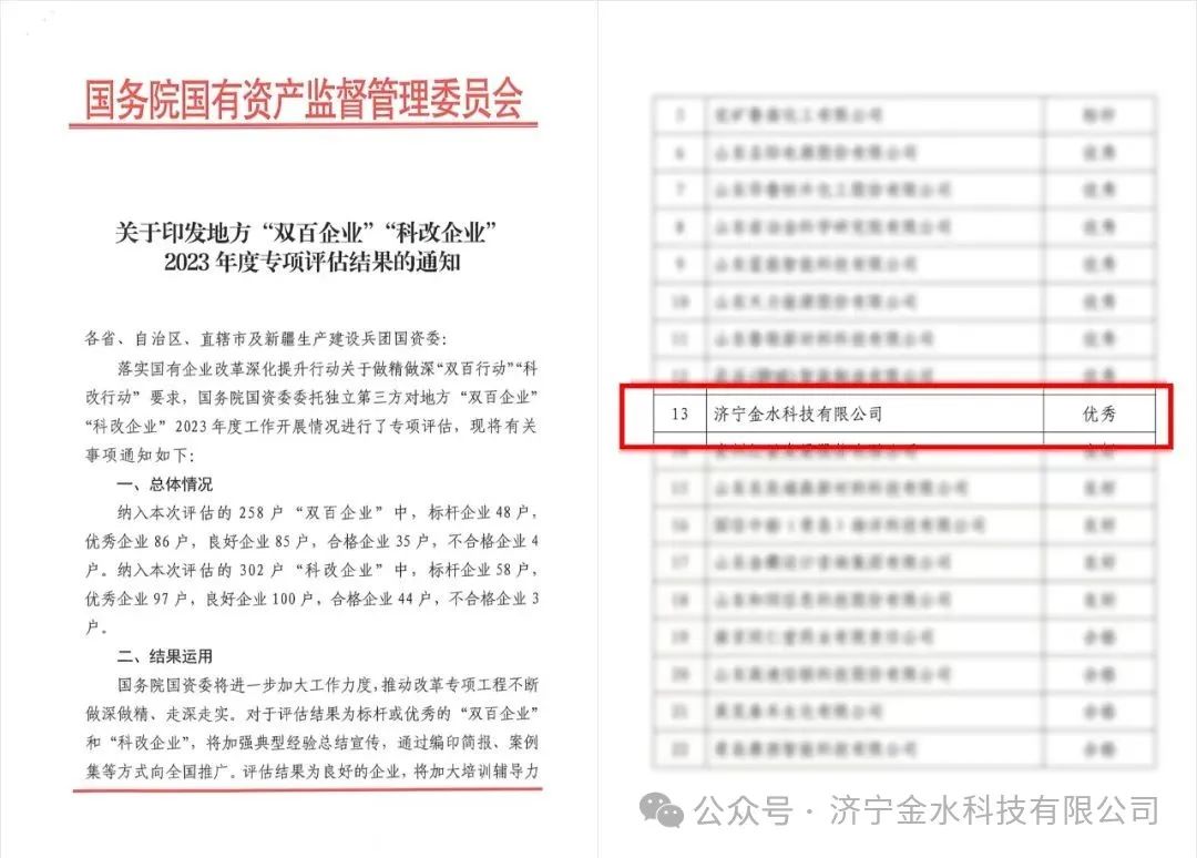 近日,國務(wù)院國資委公布“科改企業(yè)”2023年度專項(xiàng)評(píng)估結(jié)果,濟(jì)寧金水科技有限公司獲評(píng)“優(yōu)秀企業(yè)”。納入本次評(píng)估的科改企業(yè)共計(jì)302戶,其中優(yōu)秀企業(yè)97戶。