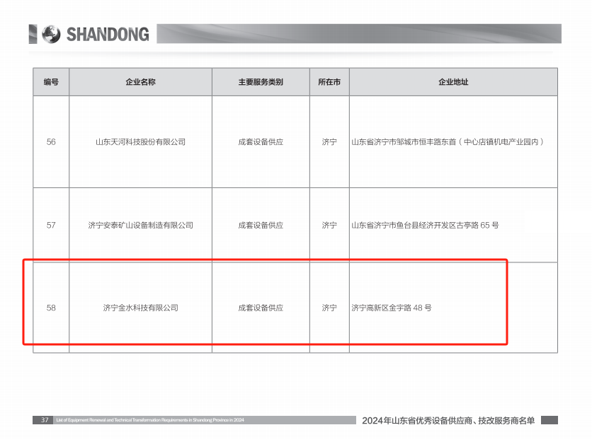 7月23日上午,全省工業(yè)領域設備更新和技術改造推進會暨第五屆技改展洽會現(xiàn)場發(fā)布《2024年山東省優(yōu)秀設備供應商、技改服務商名單》,濟寧金水科技有限公司成功入圍“山東省優(yōu)秀設備供應商”名錄。